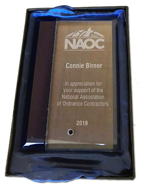 Connie Birner, of USA Environmental, received a special award from the National Association of Ordnance Contractors (NAOC), www.naoc.org, at their annual General Membership Meeting in Scottsdale, AZ on December 11, 2019. Connie was not able to attend, but USA’s VP, Brian Skubin, accepted the award on Connie’s behalf. Lanette Waite was on stage and read the following during the presentation.